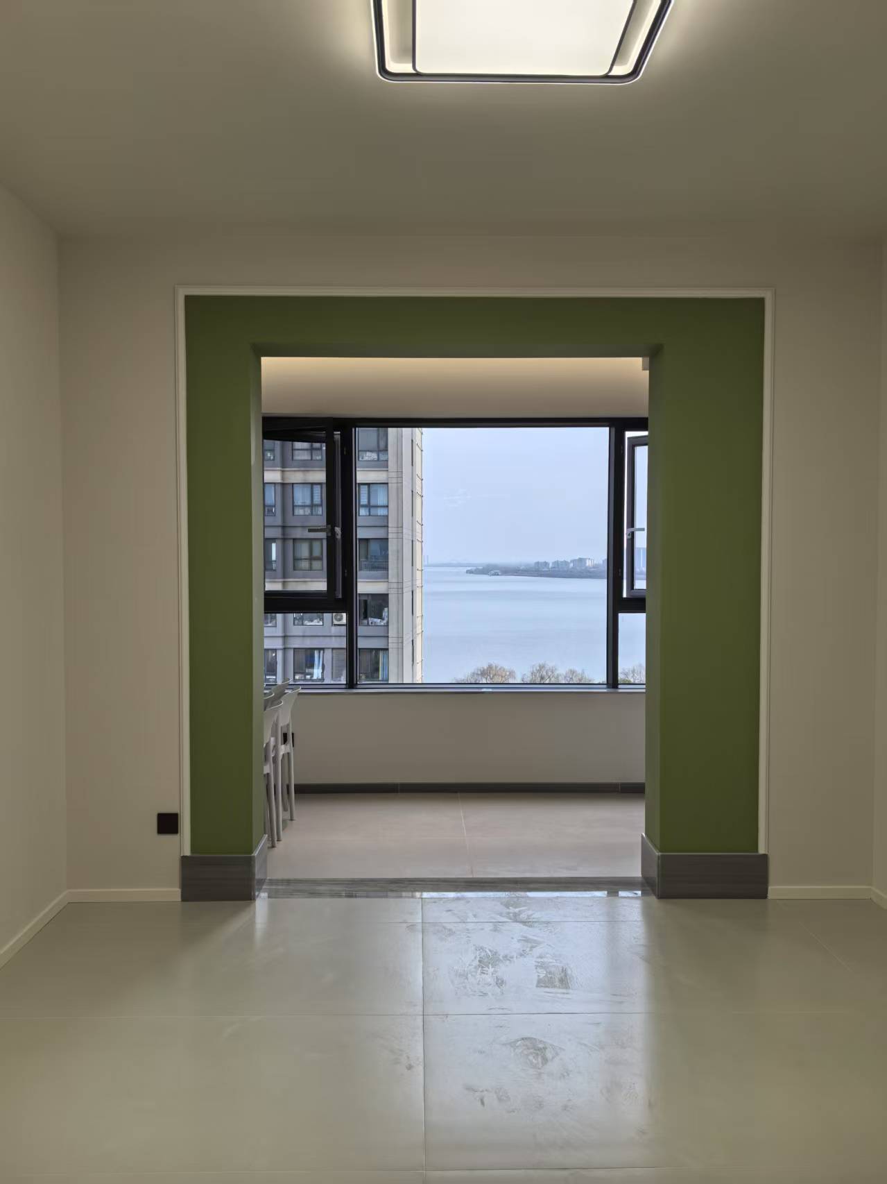 客厅通阳台的门洞似取景框,纳入如画江景,平添开阔诗意。草青色门框运用色彩心理学,其480~520的特定波长仿自然草木,缓解视觉疲劳。作为教师的女主人,劳累之余可以借色彩暗示放松身心,减轻焦虑 。巧用阳台转角,藏起洗衣机,不破坏阳台景物,空间利用与美观整洁一举两得。
