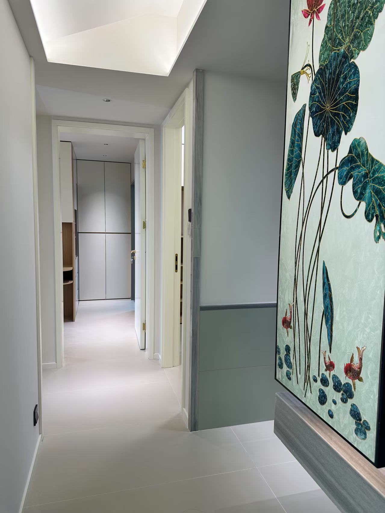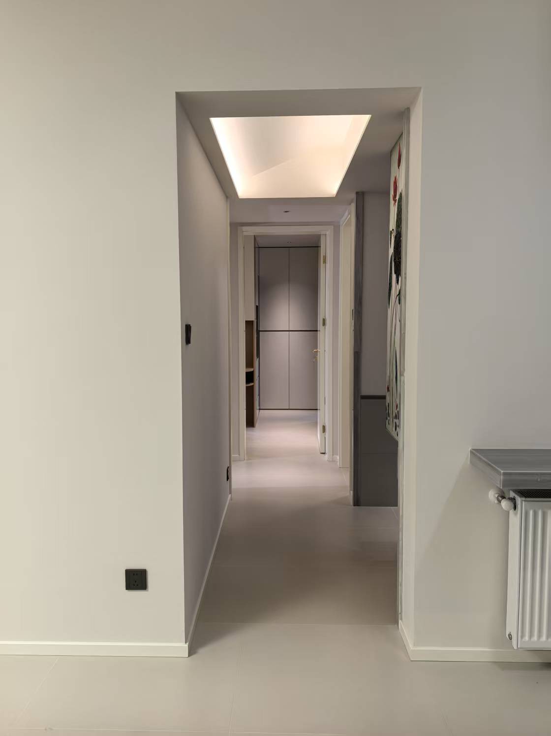 走廊经改造,拆除卫生间墙面,打破空间拘束。后移女儿房卧室门,优化“十字路口”处主卧、书房、女儿房开门状况,使人行动流畅自然,空间更显宽敞,同时引导人的思维扩大心理上的空间面积。设计梯形高低吊顶,结合灯带,营造光线错落感,补足走廊光线的同时,让人仿若行于江南雨檐,颇具诗情画意。镜柜和洗手台经精心布局,避开镜面直照,装饰画美观又合屋主心意 。