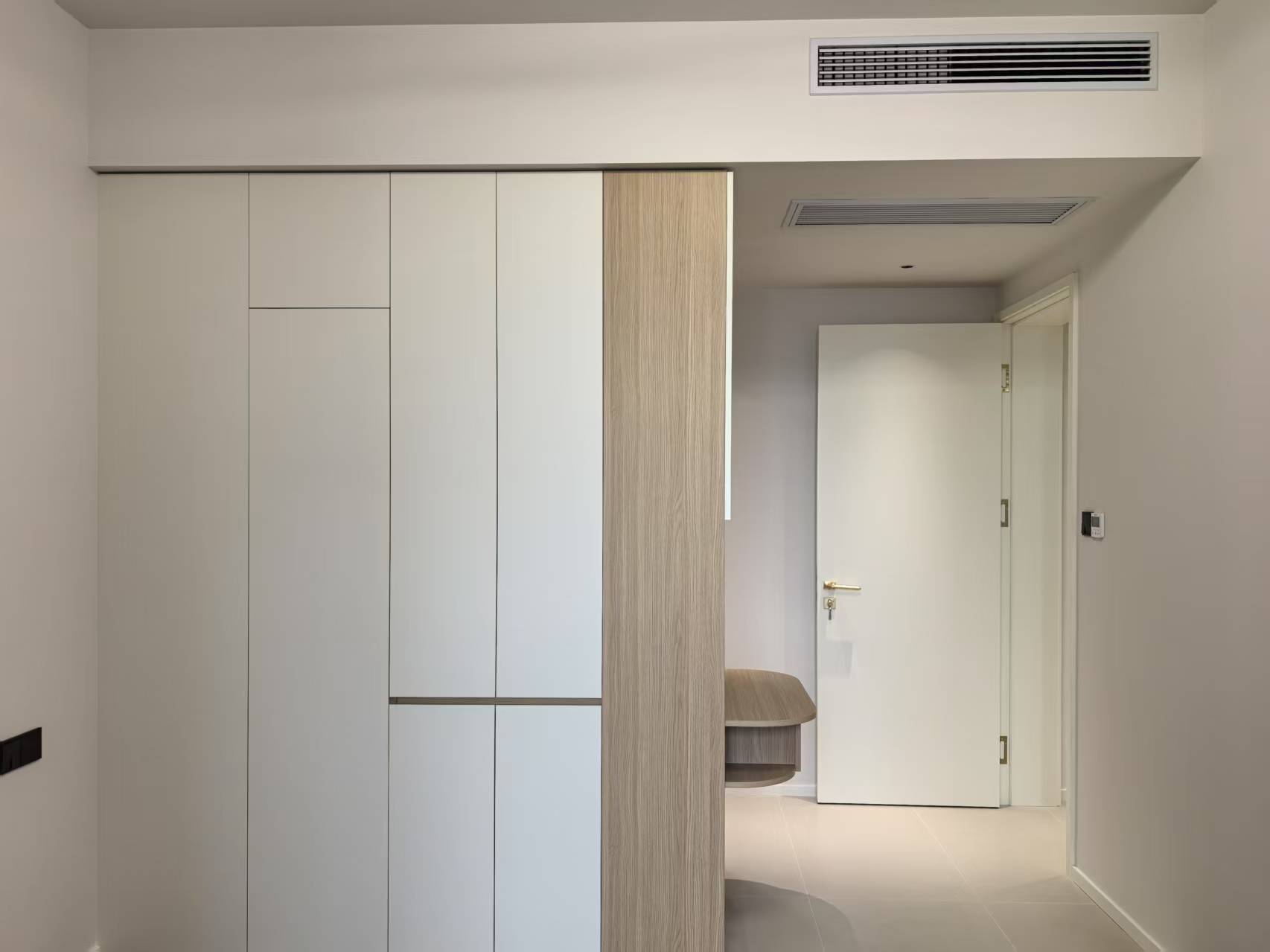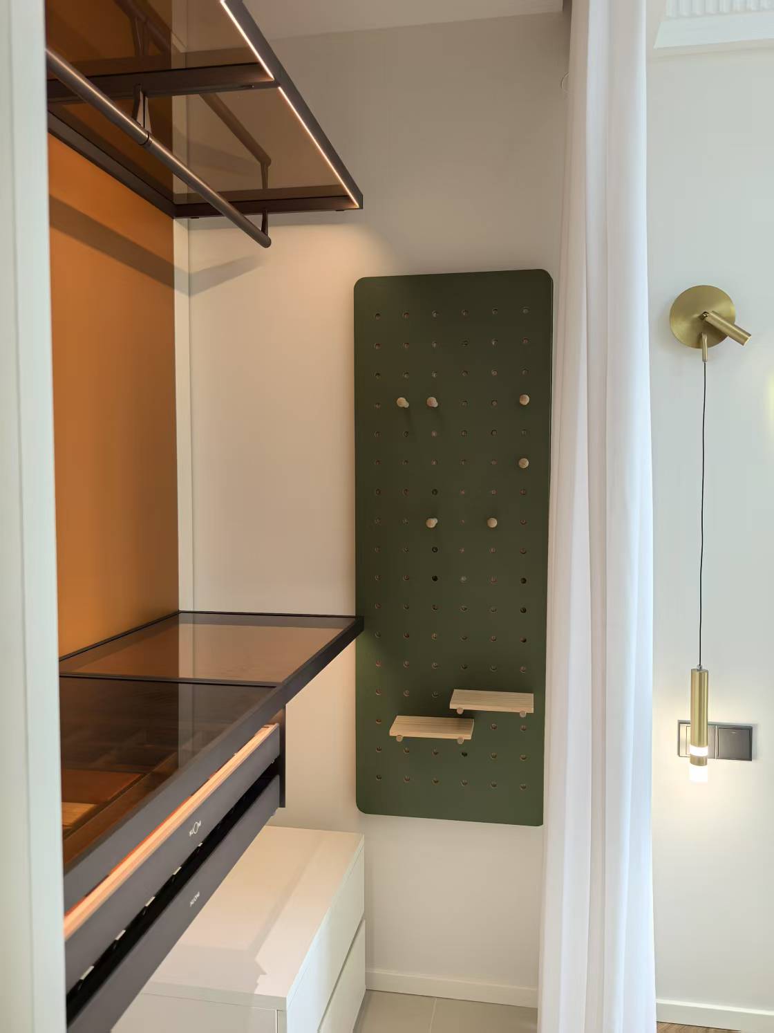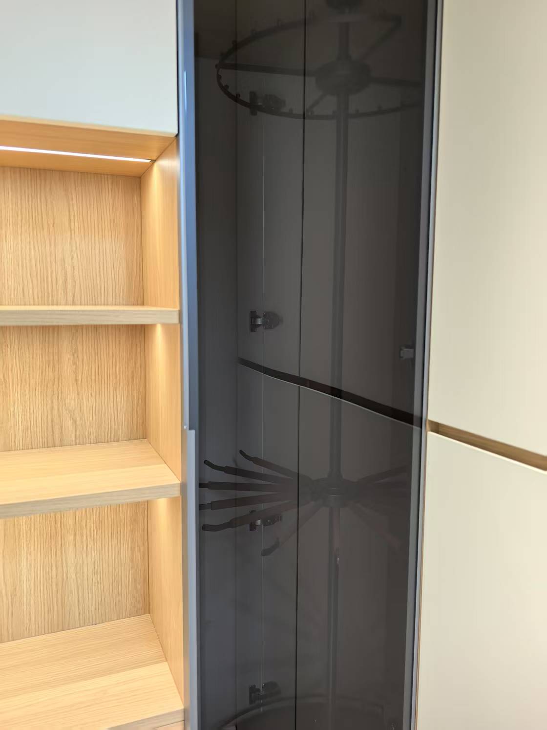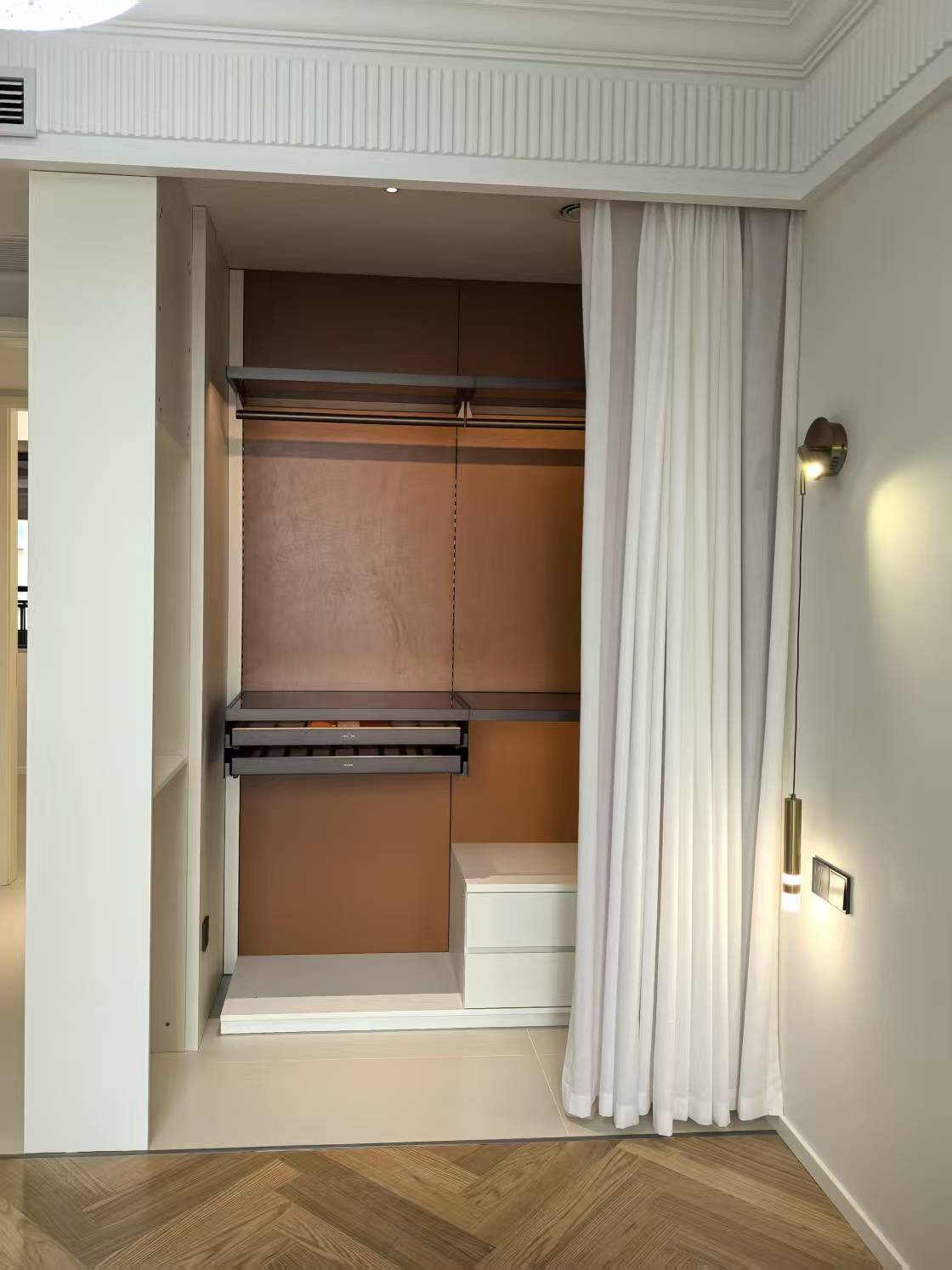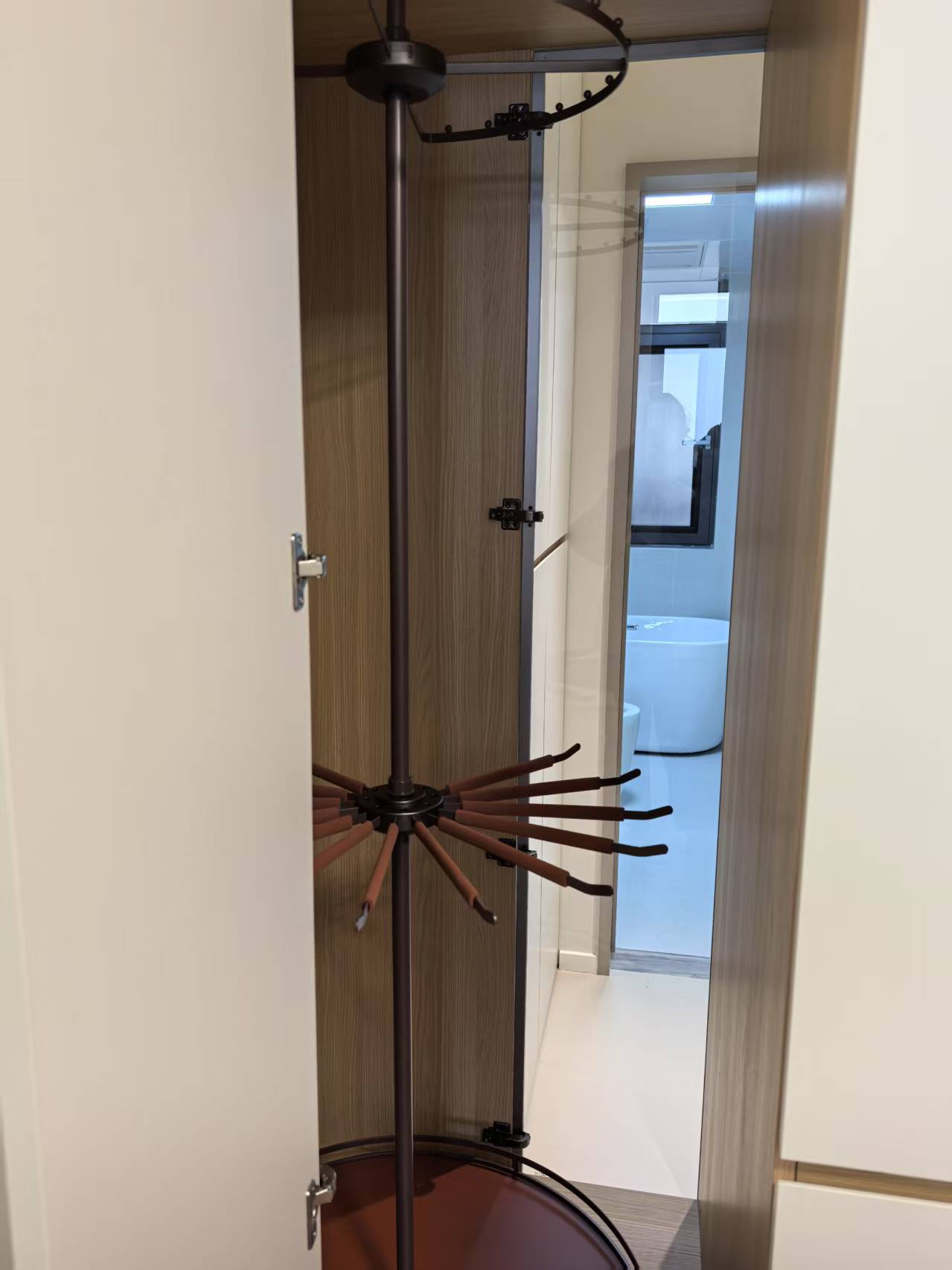 主卧衣柜设计精巧,两面开门和卫生间方设置的抽屉,便于衣物的拿取,置物格巧妙增加储物空间和储物类型。旋转衣架和灰镜柜门的设计不仅便于看清拿取衣物,特定情况还能作为全身镜。背向卧室门的梳妆台与衣柜结合,既方便女主人梳妆,又不阻碍室内流线 。