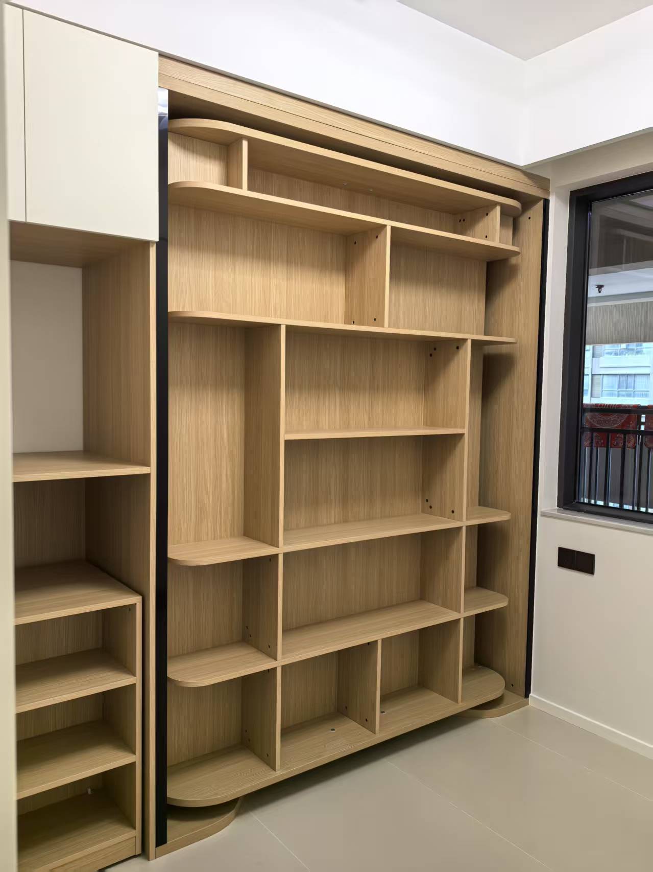 多功能书房的旋转床,展开可招待客人,收起化作书柜。推拉桌面,既满足办公需求,收起时不堵塞空间,兼具储物功能。