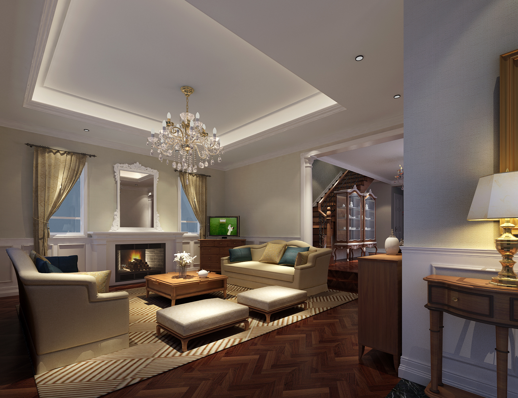 装饰细节:通过吊灯、装饰画、壁炉等元素增添空间层次感与生活气息。吊灯造型典雅,装饰画内容贴近生活或自然风景 ,壁炉作为视觉焦点,体现生活的温馨感。