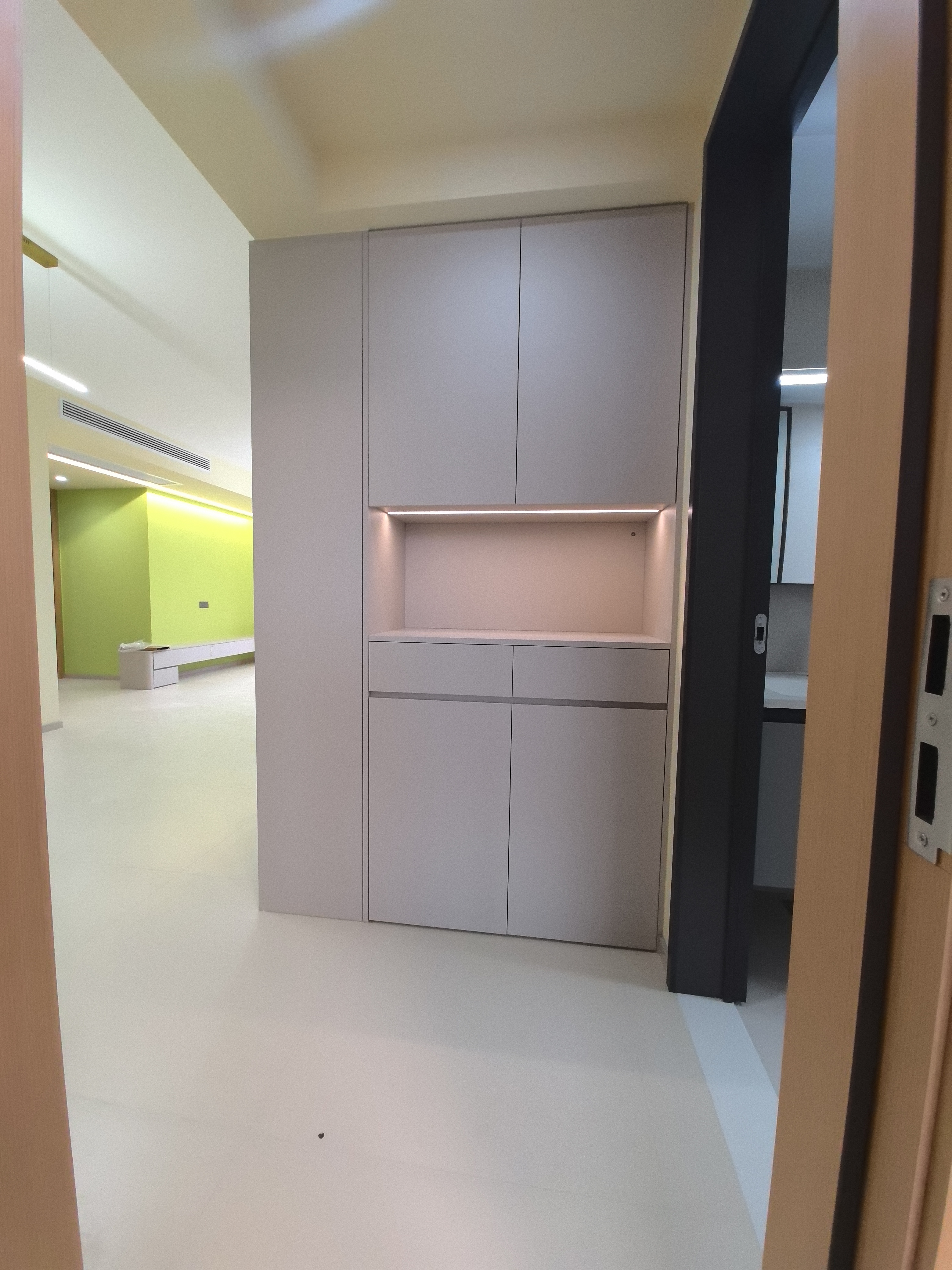 本次设计改善了原玄关活动空间不足、活动受限问题。经重新规划,巧妙调整次卧进门方向,通过空间整合,释放出更多可用面积,增设了充足的换鞋柜与多功能储物柜,满足了收纳需求。同时,重新规划活动流线,消除了原本的空间阻碍,使室内空间过渡更为自然流畅,提升了居住的便利性与舒适度。