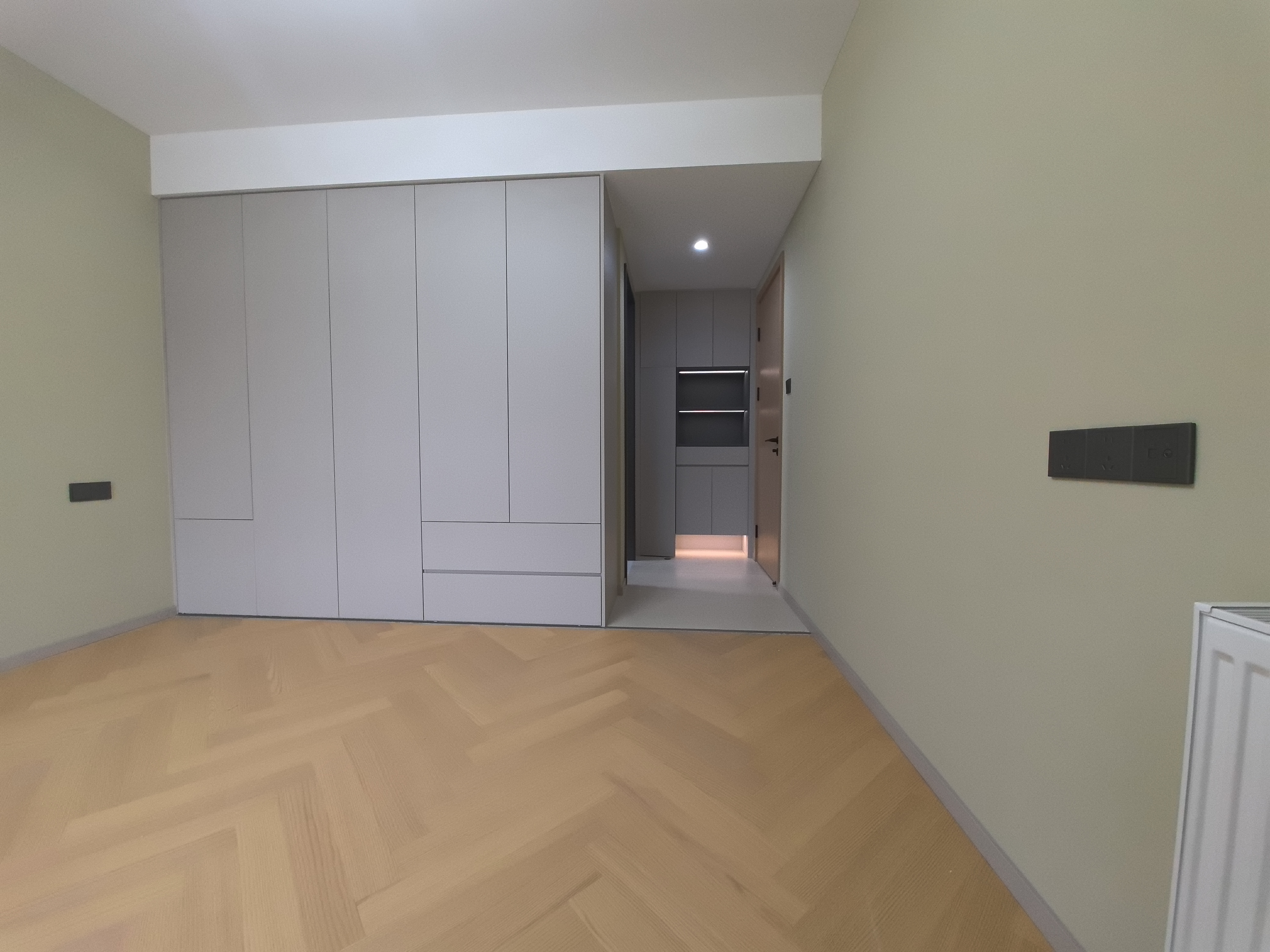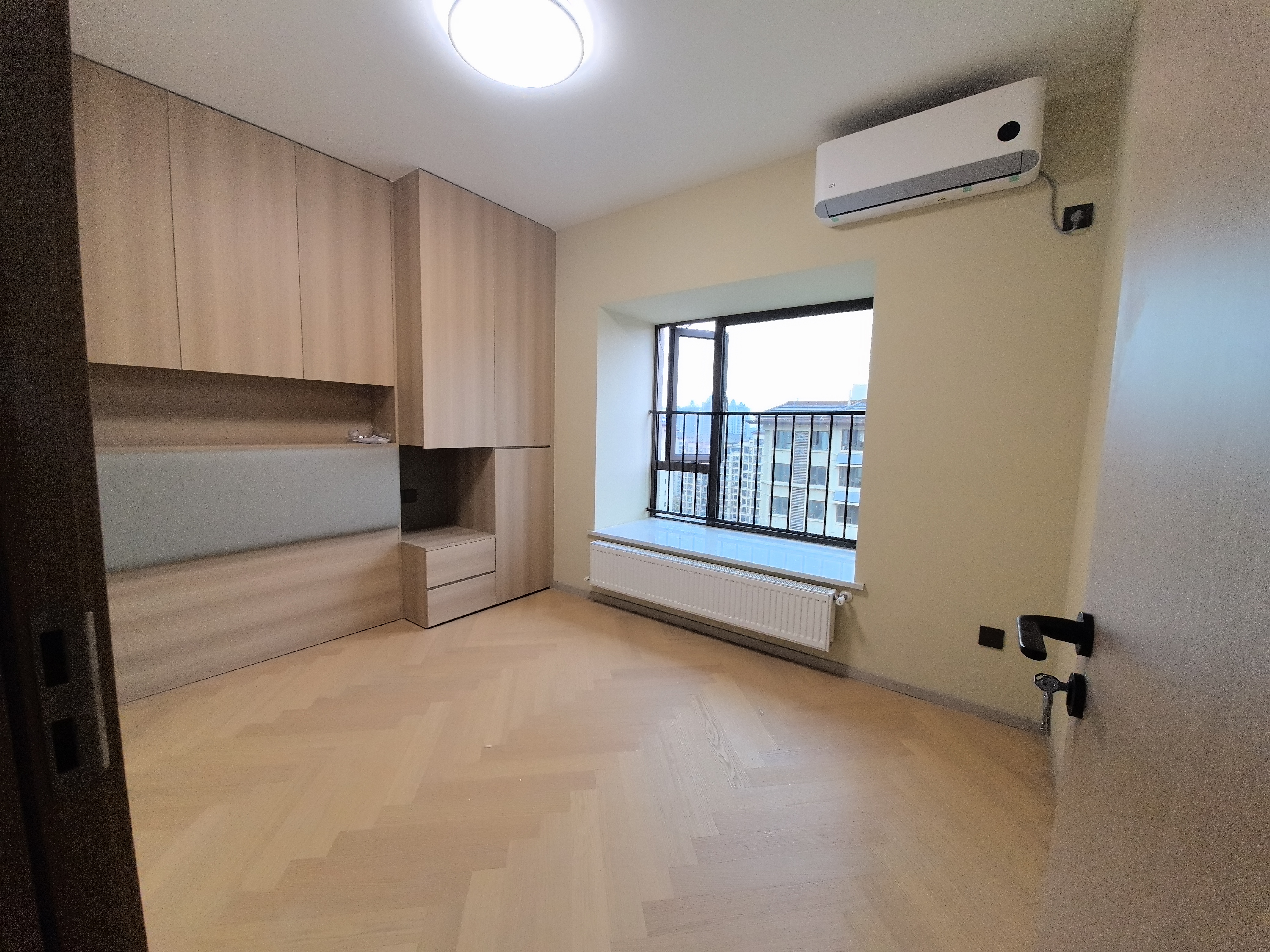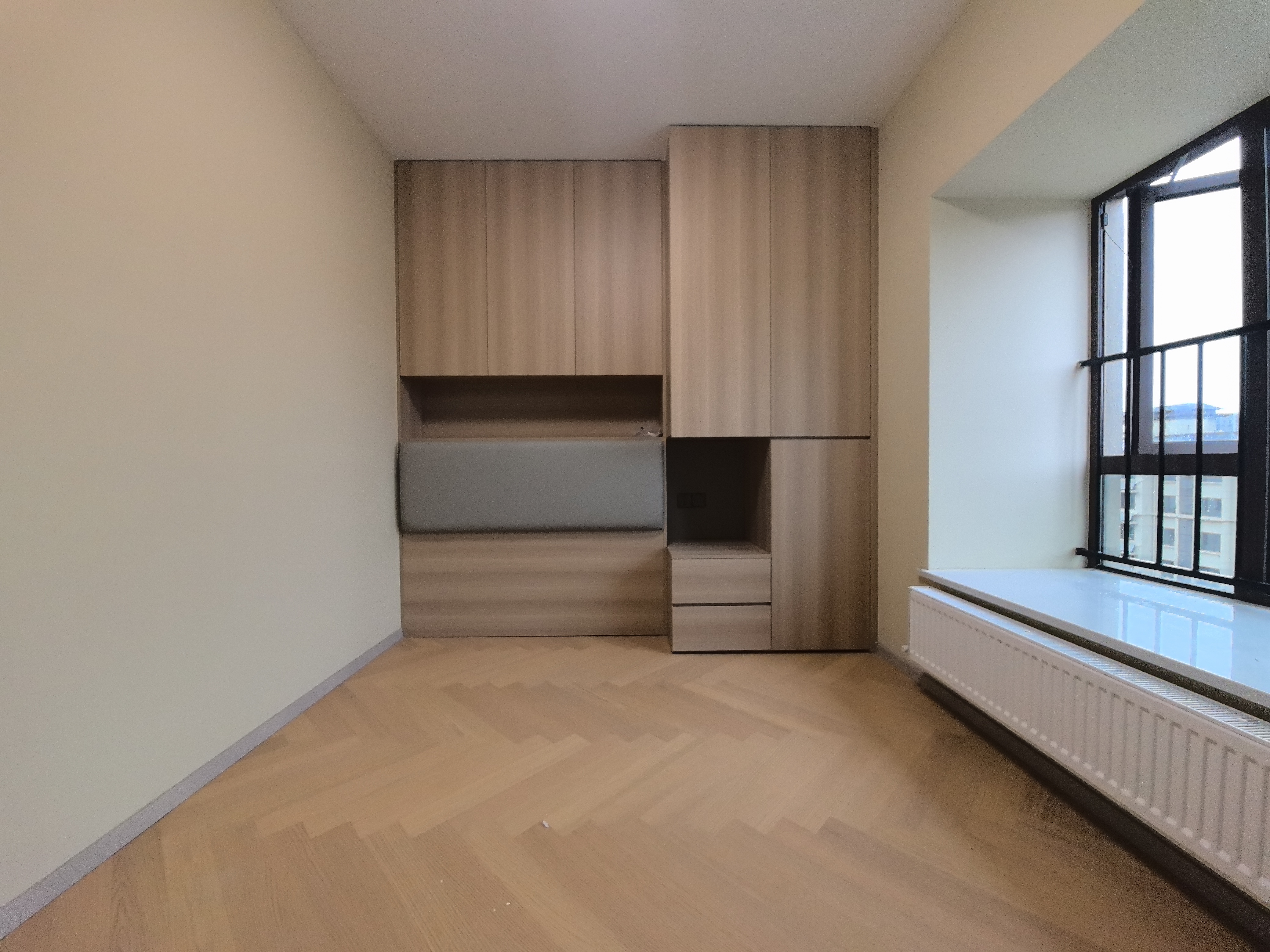 而相对空间更小的次卧的木地板和木纹衣柜,借自然纹理在视觉上扩宽空间,缓解局促。其天然质感与温暖色调,能舒缓情绪,营造温馨氛围,增强居住者的归属感与放松感。